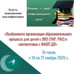 Курсы повышения квалификации по теме «Особенности организации образовательного процесса для детей с ОВЗ (ТНР, РАС) в соответствии с ФАОП ДО» в объеме 16 часов.